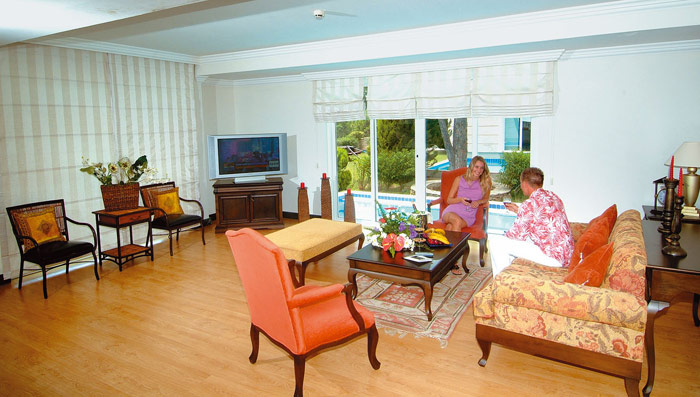 56 Villas (190 кв. м) - у входа маленькая комната для прислуги с отдельным входом и без балкона; на первом этаже - холл, телевизор, кухня, обеденный стол, электроплита и чайник, мини-холодильник, терраса, собственный бассейн - 24 кв.м; на втором этаже - две спальни с дверьми, 2 телевизора, 2 ванные комнаты, одна с джакузи, мини-бар, макс 6 чел.