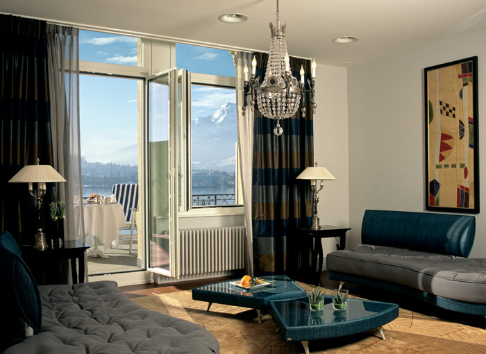 Отреставрированные интерьеры номеров выдержаны в стиле Belle Epoque. Продуманное освещение, со вкусом выдержанная цветовая гамма, мягкие линии меблировки и разнообразные мельчайшие элементы, привносящие толику особенного шарма — делают дизайн каждого номера уникальным произведением искусства. Из номеров открывается вид на Люцернское озеро и альпийские вершины.