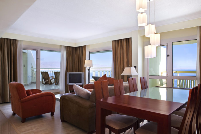King Sunset Suite - номер с видом на море и горы, Номер состоит из спальни с кроватью king и отдельной гостинной. Есть балкон. Телевизор с диагональю 25. Макс. размещение - 2 взрослых. Мраморная ванная комната с ванной.