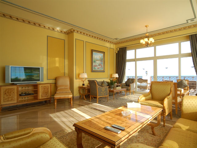1 Pharaon Suite (250 кв. м) - гостиная, 4 спальни с дверью, 3 ванные комнаты, джакузи, столовая, оборудованная кухня, факс, Wi-Fi интернет, услуги дворецкого, балкон.