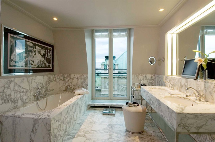 мраморная ванная комната с ванной и отдельной душевой кабиной