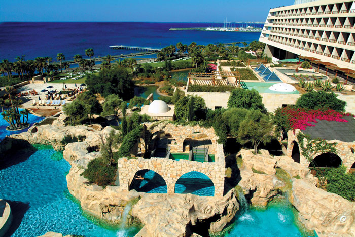 Le Meridien Limassol Spa & Resort - знаменитый отель Лимассола. Территория отеля 100000 кв. м. Отличительной чертой ландшафтного дизайна комплекса являются красивейшие водопады и каналы, необыкновенное сочетание различных видов мозаики и камня. Изысканное оформление, сочетание мрамора, позолоты и мягких пастельных тонов создают неповторимую атмосферу тепла, гармонии и уюта. Особый шик - королевских размеров кровати от Kenzo и косметика для ванной от торговой марки Hermes.