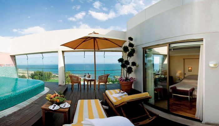 Leisure Suite Pool & Sea View (68 кв. м) - Номер Лэйжэ Сюит с панорамным видом на море. Номера расположены на четвертом и пятом этажах основного здания. Двухкомнатный (спальня, гостиная). Возможное размещение 2+1. Кровать king size. Есть номера interconnecting (могут соединяться с Twin Pool & Sea View).