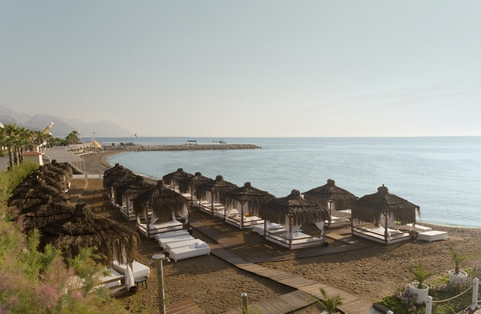 Пляж: собственный, очищенный песок/мелкая галька, протяженностью 720 м. Бухта и 2 пирса (1 пирс для VIP-гостей – бесплатно, для остальных гостей – платно, 1 пирс используется как вертолетная площадка). Бар на пляже: бесплатно. У бассейна и на пляже: зонтики, шезлонги, матрасы – бесплатно. Пляжные полотенца: бесплатно. По всей территории отеля курсируют электромобили каждые 15 минут.