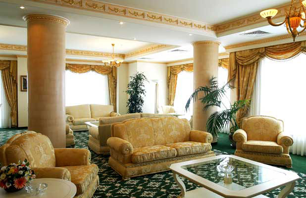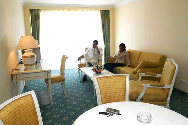 Расположен на 5 этаже. В номере гостиная с камином, рабочий кабинет, 3 спальни с дверью, 3 ванные комнаты с джакузи, одна из них с мини-сауной, 4 TV, кухня, большая терраса с шезлонгами, матрасами, столами, индивидуальный лифт. Площадь 600 кв.м.