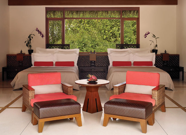 Номер состоит из двух спален с кроватями Queen size, просторной гостиной с диваном и креслами, ванной комнаты с большой ванной. Веранда визуально поделена на столовую и зону отдыха. Из гостиной открывается дивный вид на океан. К услугам гостей частный пляж и персональный бассейн.