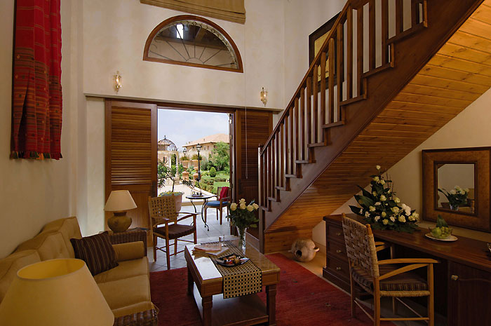 Эти двухэтажные номера являются подлинным отражением кипрского стиля. Пол в номерах выложен из каменной плитки с преобладанием терракотового цвета, а потолки сделаны из деревянных панелей и бамбука. На первом этаже находится просторная гостиная с высоким потолком и гостевая ванная комната, а второй выход на улицу со стеклянными дверьми в виде арки имеет вид на море, либо на сады отеля. Часть второго этажа занимает мезонин, где расположена спальня с гардеробом и ванной комнатой с душем. Зона спальни отгорожена льняной занавеской, которую можно отодвигать и тогда лучи восходящего солнца будут будить гостей через небольшое окно, встроенное под самым потолком.