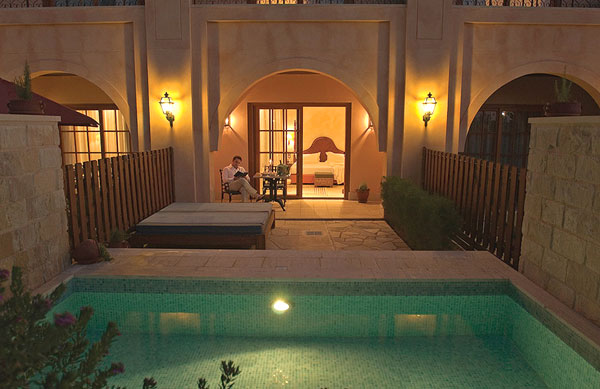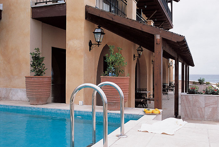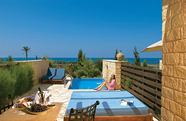 Двухэтажные виллы были созданы специально для гостей, которые предпочитают уединение и тишину. Апартаменты построены в стиле традиционного кипрского дома с гостиной на первом этаже и спальней-мезонином на втором. Гости могут располагать двумя ванными комнатами с отдельным душем. В каждом номере на первом этаже есть бассейн с возможностью подогрева воды зимой и небольшим садиком с лимонными деревьями. Рядом с бассейном расположены шезлонги для гостей, широкий зонтик от солнца, а в тенистой зоне столик и стулья. Зоны с садиками и бассейном отгорожены друг от друга стеной из светлого камня. Виллы могут быть с видом на море, либо на сады отеля.