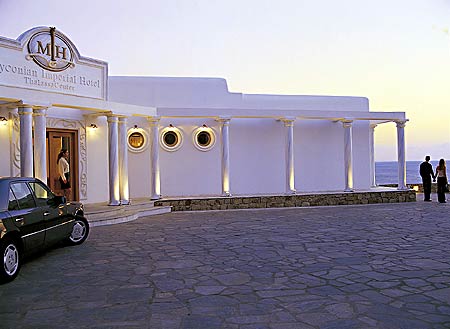 Myconian Imperial Hotel открылся в 2002 году и сразу стал лучшим на острове. Отель принадлежит престижной цепочке The Mykonian Collection, а также входит в сеть The Leading Hotels of the World.Умело вписанный в ландшафт, Myconian Imperial Hotel отличается оригинальным архитектурным решением. Здания выстроены террасами, что обеспечивает прекрасный вид на залив из каждого номера. Новенькие, с иголочки, номера оформлены очень стильно и изящно. Их нельзя назвать большими, размер стандартного номера составляет 28 кв. м, но дизайн, выдержанный в песочно-бежевой гамме, со вкусом подобранные мебель и аксессуары создают ощущение легкости. Более требовательные гости могут выбрать комнаты VIP (VIP-rooms) с частным бассейном или двухкомнатный люкс.