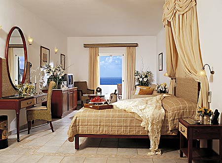 Умело вписанный в ландшафт, Myconian Imperial Hotel отличается оригинальным архитектурным решением. Здания выстроены террасами, что обеспечивает прекрасный вид на залив из каждого номера. Новенькие, с иголочки, номера оформлены очень стильно и изящно. Их нельзя назвать большими, размер стандартного номера составляет 28 кв. м, но дизайн, выдержанный в песочно-бежевой гамме, со вкусом подобранные мебель и аксессуары создают ощущение легкости. Более требовательные гости могут выбрать комнаты VIP (VIP-rooms) с частным бассейном или двухкомнатный люкс.