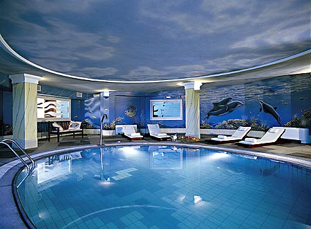 Центр также отличается превосходным дизайном: декор выдержан в глубоких синих и спокойных песчаных тонах, стены и потолок украшены росписями, мягкий приглушенный свет способствует полному расслаблению. Центр имеет 4 открытых подогреваемых талассо-бассейна, один закрытый бассейн с морской водой с подогревом, 2 джакузи с подогревом — в помещении и на воздухе, сауну, тренажерный зал, фитнесс-центр.