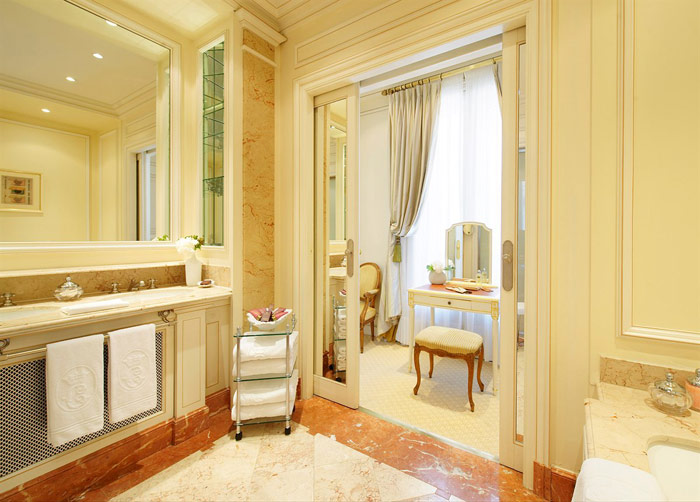 25 Executive Rooms (45 кв. м) - состоят из спальни с мини-гостиной, гардеробной и ванной комнаты с ванной и душевой. Каждый номер уникален своей цветовой гаммой и декором, но все они в равной степени отмечены просторностью, элегантными пропорциями и восхитительным интерьером во французском классическом стиле XVIII века. Возможно совмещение с номерами других категорий.