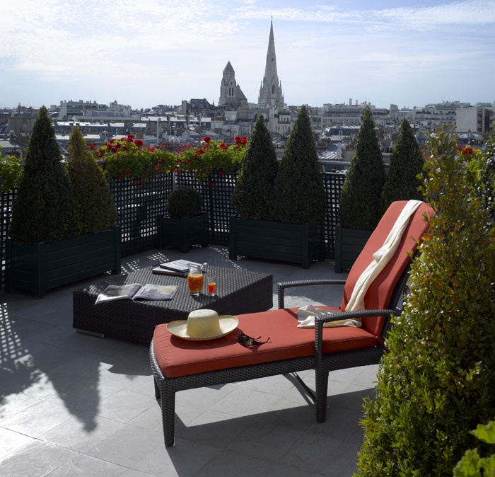 Eiffel Suite 750 (97 кв. м) - вместимость: максимум 3 человека (кровать "king-size" или одиночные). Вид на Эйфелеву башню. Suite 750 расположен на двух уровнях и располагает террасой с обзором 360°, открывающей вид на весь Париж, включая, естественно, и величественную Эйфелеву башню. Этот номер — самый просторный из всех номеров Suite в стиле "ар деко", а также из всех с цветовой гаммой "терракота", кроме того, он несколько более современный и "мужской", чем другие номера Suite. Расположенный на 7-м этаже отеля, номер состоит из холла-прихожей, гостиной, спальни и ванной комнаты. Гости также смогут воспользоваться спортивным залом и сауной, находящимися в номере и предназначенными только для них. Создается полное ощущение, что они находятся в своей собственной шикарной квартире на авеню Монтень. Холл ведет в большую гостиную с двумя диванами, обитыми бежевым бархатом с вышивкой бронзовой нитью. Слева панели из макасарского эбенового дерева скрывают бар, за которым находится игорный стол и кресла для игры в бридж. На окнах — скользящие "японские" панно из шелковых полос с вышивкой от Жана Франсуа Лесаж. Большой телевизионный экран укрыт в стене гостиной, в огромном зеркале, обрамленном в стиле "ар деко". Наверху, в большой спальне, мебель также из макасарского эбенового и красного дерева и двойные французские двери. Комнату украшают шелковые шторы цвета меди, за которыми — большая собственная терраса с видом на Париж.