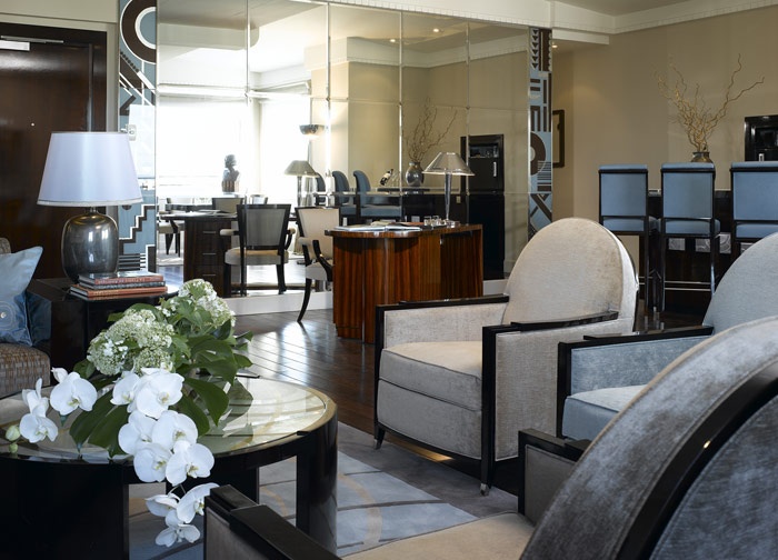 Оформление Eiffel Suite, в стиле "ар деко", навеяно Эйфелевой башней и парижским небом: небесно-голубой, напоминающий о цвете неба, шоколадный и сероватый оттенки — вот цветовая гамма этого номера. Обстановка Terrace Eiffel Suite состоит из комбинации настоящей мебели в стиле "ар деко" и изготовленных на заказ предметов, при этом основной материал — розовое дерево, макасарское эбеновое и красное дерево.