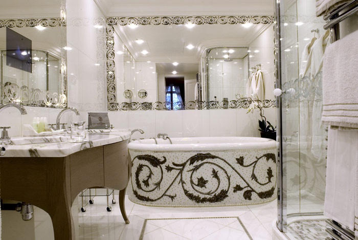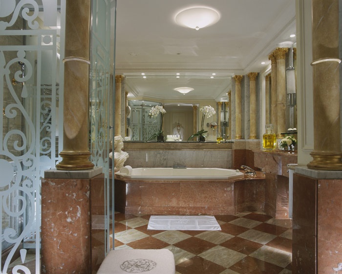 в ванных комнатах: полы и все поверхности отделаны мрамором, ванна и душ отдельно, две раковины, банные халаты и шлепанцы с вышитой эмблемой Plaza Athуnуe