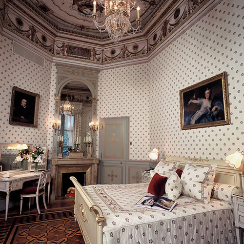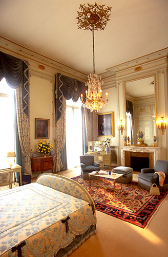 Императорские апартаменты воспроизводят величие прошедших эпох с их высокими потолками и просторными помещениями. Здесь время приостановило свой полет у входа в гостиную, записанную в "Перечень исторических памятников". Здесь воображению нетрудно совершить прогулку вдоль горельефов и барельефов XVIII века, от одного полотна старого мастера к другому, от одного предмета меблировки в стиле Ампир, обитого ярко-красной с золотом шелковой тканью, к другому. Эти апартаменты принимали многочисленных королев, которых наверняка привлекала кровать с балдахином наподобие той, что стоит в версальском кабинете Марии-Антуанетты, или успокаивающий взгляд Маркизы де Помпадур, которая как бы охраняет эти стены.