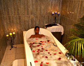 В номере: ванная комната с ванной и душем, 2 телефона, доступ в интеренет, халаты, шлепанцы, фен, джакузи, дополнительные удобства ванной.