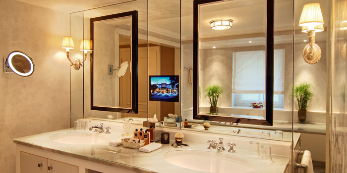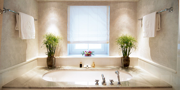 Deluxe Corner Suite lake view (90 кв. м) - один из самых роскошных номеров отеля состоит из мраморной прихожей с гостевым туалетом, отдельной гостиной и спальни. Гостиная выходит на озеро, а также на зеленый сад отеля - оазис в самом центре города, и частично на канал В спальне есть отдельная гардеробная, кровать king size и телевизор. Ванная комната в мраморе состоит из большой ванной из черного мрамора, отдельного туалета и душевой кабины с возможность настраивать душ на три различных режима .