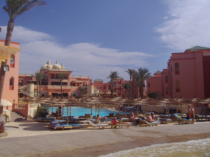 | Наконец-то нашлось у меня время написать свой отзыв, может кому-нибудь пригодится. С самого начала хотелось бы сказать несколько слов о туроператоре с которым мы ездили, а ездили мы с Тез Туром. Есть у нас к ним претензии. Во-первых, когда мы приземлились в аэропорту в Хургаде, там нам надо было заполнять карточки (миграционные или какие там они фиг их знает), так вот эти самые карточки естественно на английском языке. Никаких объяснений как их заполнять мы не получили, это ладно знаем язык, а кто не знает тому было трудновато. Куда идти и что делать дальше –опять никаких объяснений. Гид в яркой желтой маячке куда-то ускакал. Огромное спасибо форумчанам, по их объяснениям разобрались. Этих хреновых гидов мы увидели только на выходе. Они стояли там живой стеной, трясли рекламными буклетами и указывали куда идти (а автобусы метров через сто - не увидеть трудно). Развезли нас по отелям, опять никаких объяснений. Бросили нас сирых и убогих на произвол судьбы. Короче как хотите, так сами и разбирайтесь. Весь прикол в том, что на ресепшене ну очень плохо говорят по-русски. Они смотрели на нас, а мы на них, ждали действий. Заселили нас часа через полтора, причем немцев, которые приехали после нас, заселяли в первую очередь. Самое что обидное, приехали мы где-то в 13.00, пока они телились - время обеда истекло, а жрать-то хочется. Где что находится и как это все работает, мы определяли путем самотыка. Отдельное «спасибо» тез туровцам за экскурсии. А особенно за «Райский остров». Охренеть можно какой «райский» отдых нам устроили. Во-первых, нам сказали свои ласты и маски не брать, и вот первый вывод на будущее – не верить!!!!!!!!!!! Такого говна мы не ожидали. Все протекает, держится на честном слове – плавать и смотреть рыбок мы не смогли. Во-вторых, привезли нас на этот сраный остров, гид сказал: «У вас есть свободное время 3 ЧАСА», и опять урыл. Люди, 3 ЧАСА на страшнейшей жаре, где даже зонтики не спасают и нет питьевой воды – это что-то. Ладно если бы хоть программа какая-нибудь была бы, а так сидели мы под зонтиками и смотрели на белый песок, мать его за ногу. Женщине одной стало плохо, она в обморок хлопнулась и откачивали её сами туристы, так как наш гид оказался на катере до которого мы не доорались. Я не знаю, может все это нормально, но мы были первый раз и впечатления не очень приятные. Теперь по самому отелю. 1. Территория очень приятная, везде зелень, цветы. Сам отель очень красивый, ухоженный, новенький. Сказка, да и только. Мы были во многих отелях. Наше личное мнение – этот по архитектуре и порядку самый лучший. Идеальная чистота. Все блестит и сверкает. Только вот запах при поливе не очень. Бассейнов очень много и для маленьких детей, и для взрослых. Глубина нормальная. В бассейнах чисто. Хлоркой воняет, когда они вечером воду меняют. Потому и не дают купаться. Горки работали не все, а по три за раз. К горкам надо как-то приспособиться. Моя жена летала как торпеда, а я чего-то застревал, приходилось толкаться руками. И что самое неприятное, но это относится к горкам и в аквапарке, стыки везде аховые. С той части тела на которой катаешься можно снять стружку. На территории отеля много магазинов, но брать там что-то не надо или надо наглеть также как они. Все приветливые, общительные, но хитрожопые. Один большой минус этого отеля – это очень низко летающие самолеты. Так ни