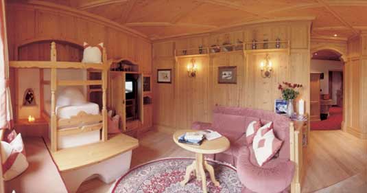 • семейные апартаменты «Kessel» (85 кв.м): есть большая спальня с двуспальной кроватью, к которой примыкает ванная комната с сауной и джакузи; вторая спальня с балконом и двуспальной или односпальной кроватью, к которой примыкает ванная комната с душем и туалетом; просторная гостиная с диваном, креслом и журнальным столиком, балкон. В большинстве номеров есть традиционные печи;