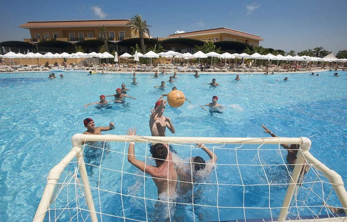 | ... Продолжение блюд примерно доходит до 30-ти, тут тебе и мясо гриль, и какие-то китайские приблуды и всяко разно. В промежутке между завтраком и обедом есть пляжный снек - гамубургеры, пицца, хот-доги, салаты, спагетти. В общем любителям поспать будет что пожрать )) Ну и блага типа мороженного у бассейна (только с 12 до 15), сладкая вата, лепешки с начинкой, тоже бесплатно. Ночью можно заказать в номер сендвичи, они не то чтоб прямо супер но большие и вполне сьедобные (колбаса+сыр+зелень в длинной булке). Кухня короче - 5 баллов с плюсом. Бассейны чистейшие. Каждый день все чиститься, жесткость воды и т.п. контролируется (сам видел как берутся пробы), ну в закрытом конечно воняет хлоркой. Теперь о главном (для меня лично). Анимация... Это АНИМАЦИЯ!!!! Анимационная команда - МЕГА СУПЕРПУПЕР!!! Мальчики все турки, а девочки кроме костюмера все наши (просто красавицы). Барышни Женя и Аня вообще класс - замечательное отношение к детям и вообще чувствуется, что девчонки работают от души. Как поется в песне "не великие таланты, но понятны и просты, мы певцы и музыканты, акробаты и шуты". Ребята работают по полной программе - игры на берегу и в воде днем, вечером детская дискотека (двое суток уже как приехали, дочка постоянно напевает песенки мини-клуба и танцует танцы которые заучила). Причем детей аниматоры собирают сами во время ужина и это уже целый ритуал (детей в отеле ОЧЕНЬ много). После мини-клуба в амфитеатре некоторое время просто музыка играет, а потом начинается вечернее шоу. Есть очень смешные моменты, есть не очень, но главное, что вовлекают в свои спектакли народ, устраивают конкурсы (мисс отель, мистер отель, лучшая пара отеля). Ко всему прилагаются - футбол, теннис (большой и настольный), мини гольф, пляжный волейбол, баскетбол в воде или водное поло. Не будьте занудами и дайте себя развлекать. Поверьте что эстафета в которой надо переплывать бассейн сидя на серф-доске на которую каждый раз садиться новый член команды, это очень весело, особенно когда вы пытаетесь усидеть на ней в вдевятером и ещё и доплыть до другого берега)) Вечером дискотека в диско-клубе, в баре на аллее живая музыка. Для детей - детская площадка, лягушатник с горками, рисование, боди-арт (вернее фейс-арт). Для любителей тренажеров - тренажерный зал в фитнес-центре и есть фитнес-центр у бассейна, такой... облегченный. Сауна так себе... но проблемы больше устраивают те же наши отдыхающие (даааавай плескать воду на камни), турецкая баня. Массажи все платные, но при этом вполне качественные. По приезде не пожалейте 60 баксов и возьмите первую программу салона. В неё войдет сауна для разогреву, пиллинг тела, пенный массаж (если вы с ребенком, то ему пенку сделают бесплатно, детям это ОЧЕНЬ нравится), полный, от пят до головы, массаж с маслами, маска для лица (весь комплекс занимает около часа). Ну что ещё… ресторан Ля Карт. Один раз можно заказать бесплатно рыбный и один раз турецкий. Турецкий повеселее. Кстати, не пугайтесь местной кухни. Турецкая кухня не жирная (они не едят свинину), мясо в основном курица или индейка, ягнятина. Очень много вариантов тушеных овощей и т.п. Ну конечно много специй но, как правило все не острое, а скорее пряное. Кроме того на кухне данного отеля неплохо приспособились к запросам нашего брата. Тут тебе и жареная, вареная, тушеная, печеная картоха, яишня с помидорами, омлеты