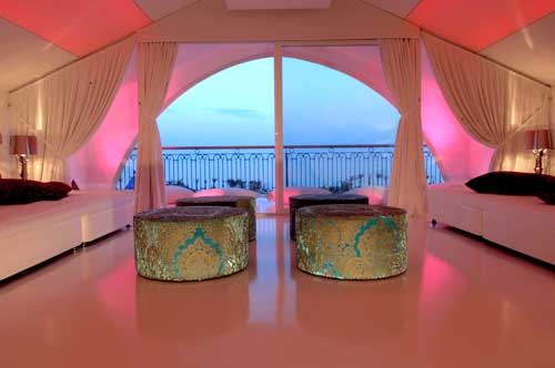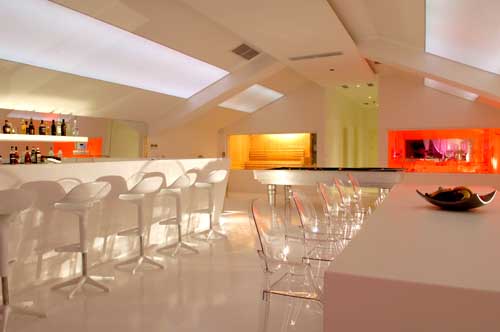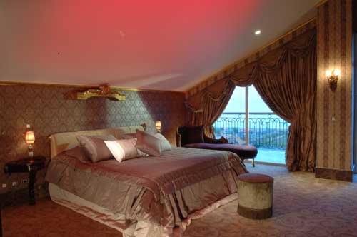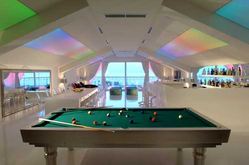 1 Мadonna Suite (175 кв. м) - белое великолепие. Номер выполнен в стиле минимализма и представляет собой белый пентхауз, со специальной звуковой системой (Dolby Surround) и светосистемой (потолок с подсветкой). Отдельный этаж с отдельным входом. Одна большая комната в современном стиле, поделенная на зоны: зона спальни с 2-мя кроватями King size, зона отдыха с бильярдным (американским) столом. Сауна с мультифункциональным душем, отдельная ванная комната с джакузи и туалетом, отдельная туалетная комната, гардеробная комната. С террасы, обложенной белыми подушками, открывается панорамный вид на море. Отдельная кухня расположена на этаже. Специальная аудиосистема позволяет использовать номер для проведения вечеринок и праздников.