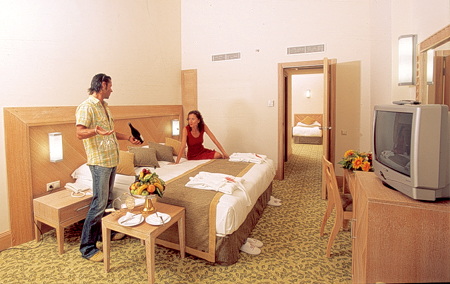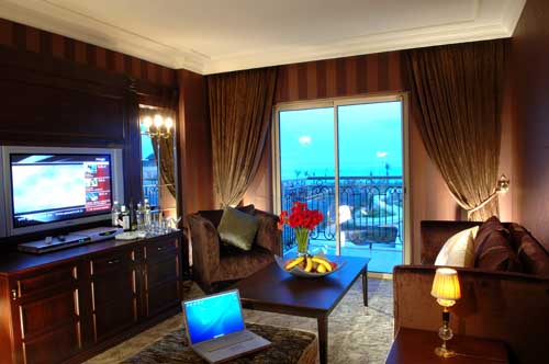 3 Sultan Suite (81 кв. м) - макс. 4 чел., трехкомнатный номер с видом на море. Две раздельные спальни, одна из них с двуспальной кроватью и отдельной ванной комнатой с джакузи, душем, туалетом; вторая - с двумя односпальными кроватями и ванной комнатой с ванной и туалетом (спальни изолированы). В каждой спальне есть телевизор. В холле - мягкий уголок, большой плазменный ТВ, DVD, отдельная туалетная комната. У номера два отдельных входа, что позволяет разместить с отдыхающей семьей обслуживающий персонал или службу охраны.