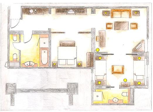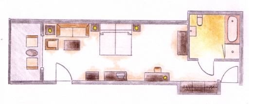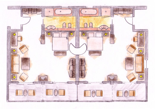 • Family Suite with Two Bedroom and Sea View (94 кв. м) с панорамным видом на море, расположены в главном здании отеля, состоят из основной спальни открытого плана, просторной гостинной, спальни для детей, отделяющейся от гостинной раздвижной деревянной дверью, просторная ванная комната с отдельной душевой кабиной и отдельным туалетом, в спальне для детей - душевая кабина и туалет. Размещение: 1-4 человека.