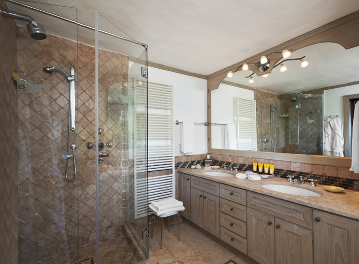 ванная комната, облицованная итальянским мрамором, с ванной, душем, в некоторых номерах имеется джакузи