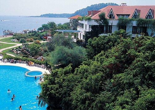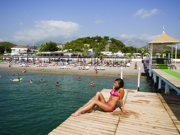 в 65 км от аэропорта г. Анталия, в 10 км от г. Кемер, в посёлке Чамьюва, на самом берегу моря.
