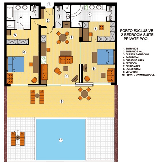 Porto Exclusive Two-Bedroom suite with Private Pool (120 кв.м.) - роскошный номер с восхитительным видом на море, состоит из 2 спальных комнат, 2-х больших ванных комнат, просторной гостиной с отдельной обеденной зоной и баром, 2-х гардеробных комнат, собственного бассейна и большой меблированной веранды (130 кв.м.). Идеальны для семейного размещения до 6 человек.