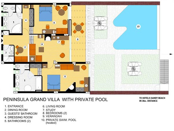Peninsula Grand Villa (120 кв.м.) - в номере 2 спальни, просторная гостиная и столовая внутри помещения и снаружи, 2 роскошные ванные комнаты, обе снабженные ванной Airbath, в одной парная, дополнительный душ/туалет в гостиной комнате, просторный частный сад (140 кв.м.) с обустроенной территорией и бассейном с подогреваемой морской водой и прямым выходом к песчаному пляжу. Идеальное место для отдыха всей семьей (максимальная численность – 6 человек).