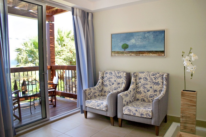 Junior Bungalow Suite Sea View (45 кв. м, включая балкон) – состоит из спальни, гостиной открытого типа с диваном, мраморной ванной комнаты. Основу интерьера составляет деревянная мебель, удачно сочетающаяся с занавесками бело-голубых тонов. С балкона открывается неповторимый вид на залив Элунды. Расположены на 1-м этаже и в самых живописных уголках сада. Макс. размещение - 2 чел.