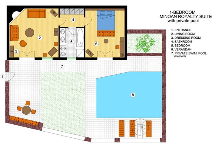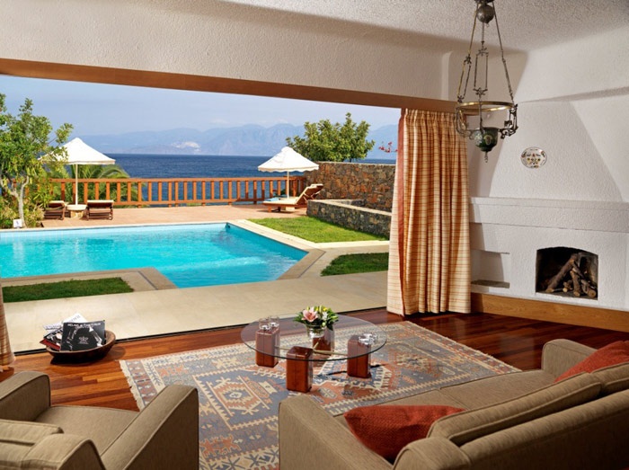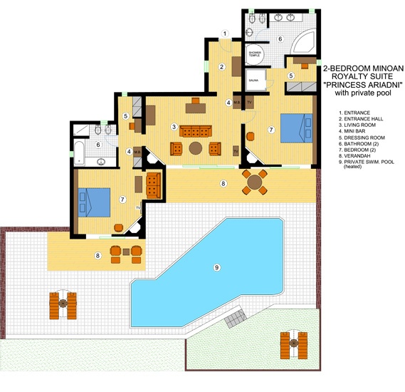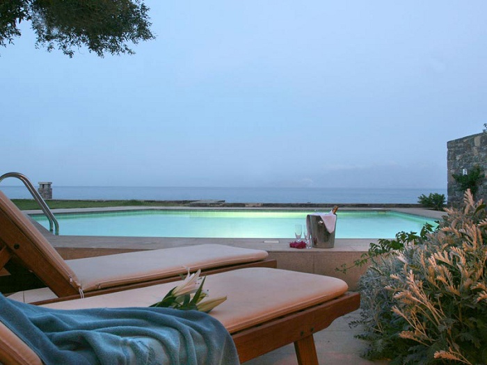 • King Minos Royalty Suite with private pool (150 кв.м) - превосходное бунгало, с великолепным дизайном с использованием местного камня и дерева, номер состоит из 2-х спален, просторной гостиной с камином, гардеробной, 2-х ванных комнат с ванной и отдельной душевой кабиной (одна с паровым душем), тренажерного зала, сауны, парной, террасы с обеденной зоной и собственным подогреваемым бассейном с морской водой, в номере — CD/DVD - проигрыватель.