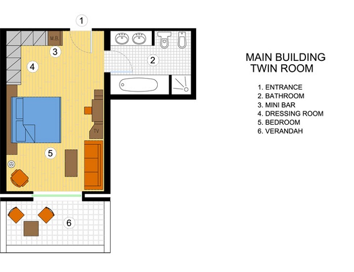 • Twin Room (30 кв.м.) - номер состоит из спальни с гостевой зоной, ванной комнаты (некоторые с отдельной душевой кабиной), балкона или террасы с видом на море. Максимальное размещение — 2 взрослых + 1 ребенок.