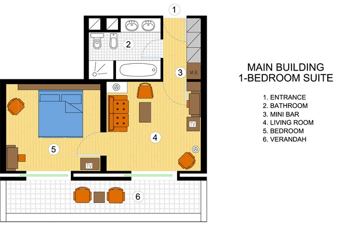 • One-Bedroom Suite (42 кв.м.) - номер состоит из спальни, отдельной гостиной, ванной комнаты с ванной и отдельной душевой кабиной, балкона или террасы с видом на море. Максимальное размещение — 3 взрослых.