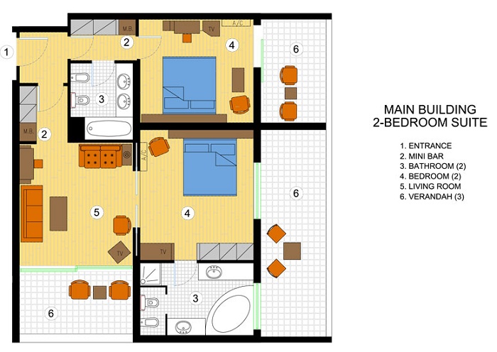 • Two-Bedroom Superior Suite (80 кв.м.) - просторный номер состоит из 2-х спален, отдельной гостиной, 2-х ванных комнат, одна из которых с ванной и отдельной душевой кабиной, балкона или террасы с видом на море, некоторые с собственным бассейном. Максимальное размещение — 5 взрослых.