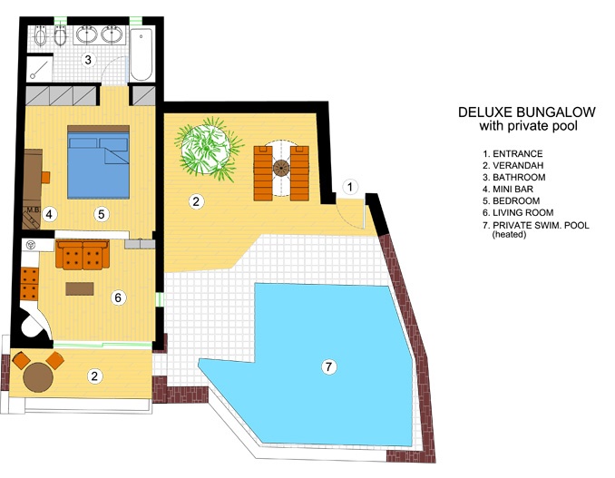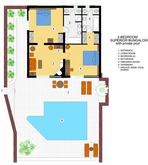 • Two-Bedroom Superior Bungalow with private pool (90 кв.м.) - просторное бунгало состоит из 2 спален, отдельной гостиной с камином, 2 ванных комнат с ванными и отдельными душевыми кабинами, меблированной террасы/сада с подогреваемым бассейном с морской водой и великолепным видом на море. В номере есть CD/DVD - проигрыватель, некоторые номера — двухуровневые (вторые спальня и ванная комната находятся на 2 этаже).