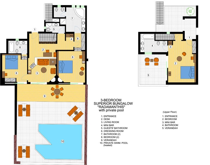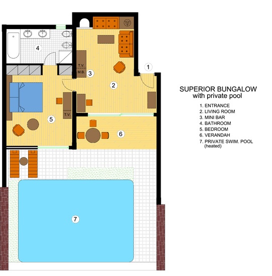 • Three-Bedroom Superior Bungalow with private pool (110 кв.м.) - двухэтажное бунгало: на 1-м этаже - 2 спальни, гостиная с камином, 2 ванные комнаты с ванной и отдельной душевой кабиной, терраса с собственным подогреваемым бассейном с морской водой; на 2-м этаже - спальня, ванная комната с ванной и отдельной душевой кабиной; в номере — CD/DVD - проигрыватель. Максимальное размещение — 7 взрослых.