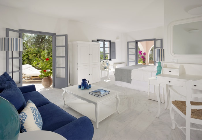 Presidential Villa (170 кв.м.) - номер состоит из 3 спален с кроватями в стиле люкс, гостиной с просторной столовой зоной, 3 ванных комнат с ванными с эффектом гидромассажа, патио с приватной открытой джакузи и частным открытым подогреваемым бассейном с эффектом гидромассажа; выходит на деревню, море и виноградники. Отличительная особенность – внутреннее убранство в стиле изысканной неоклассики, 3 телевизора в гостиной и в спальнях, полностью оборудованная кухня, гардеробные.