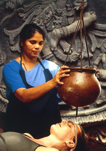 Последовательное выливание тонкой струйкой прохладного, содержащего лекарственные вещества масла на лоб в течение 40-60 минут.