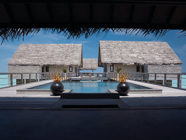 Водные бунгало с панорамным видом на море, состоящие из спальни и холла, ванной комнаты и открытой веранды (74 кв.м./53 кв.м.), с частным бассейном, с собственным бассейном с зоной для загара, открытым душем, имеется прямой спуск в лагуну, располагаются на северо-западе острова рядом с пляжем.