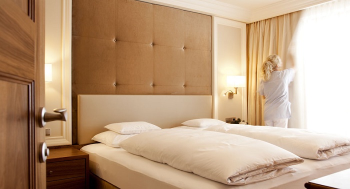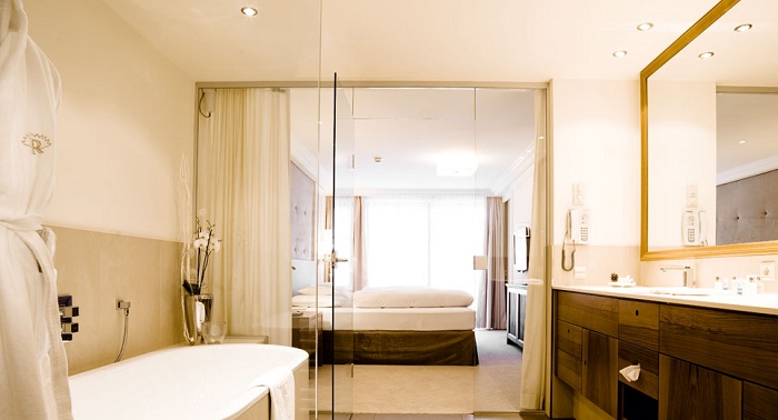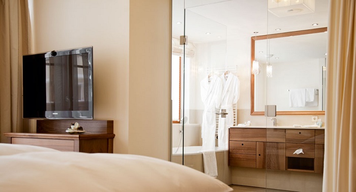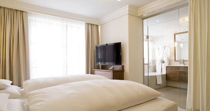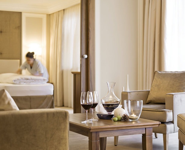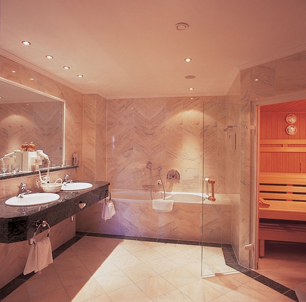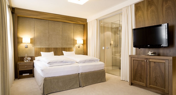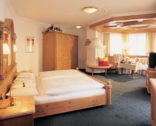 Просторный номер, состоит из гостиной с тирольской печью или камином, 2 спален, 2 ванных комнат (в одной - ванна, отдельный душ, два умывальника, туалет и биде, в другой – ванна, душ, умывальник и туалет), отдельной туалетной комнаты, балкона. DVD-плеер. Размещение: 4 чел.