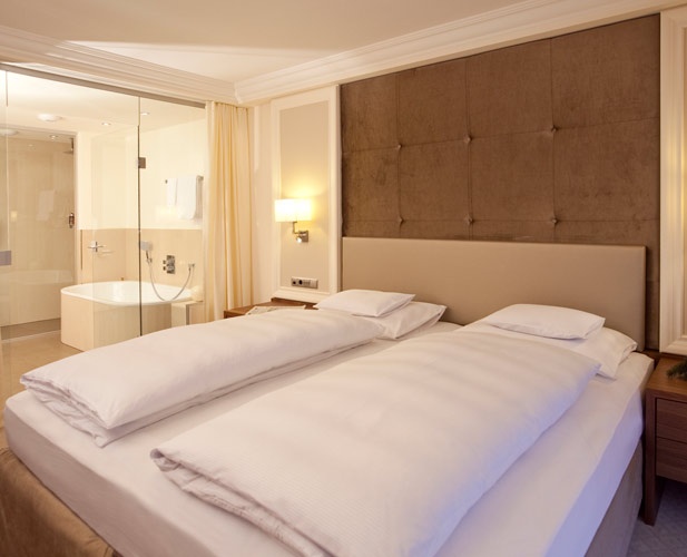 Просторный номер, состоит из прихожей, гостиной с тирольской печью, 2 спален, каждая из которых с собственной ванной комнатой с ванной, душевой кабиной, двумя умывальниками, туалетом и биде, дополнительной туалетной комнаты, 2 балконов. В каждой спальне и ванной комнате есть телефон. DVD-плеер. Размещение: 4 чел.