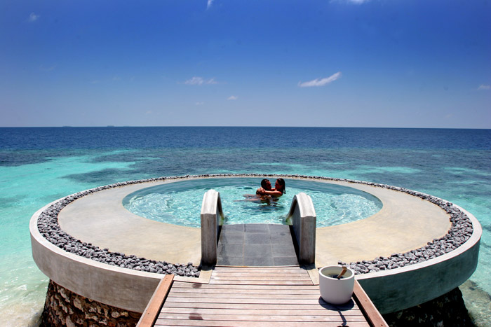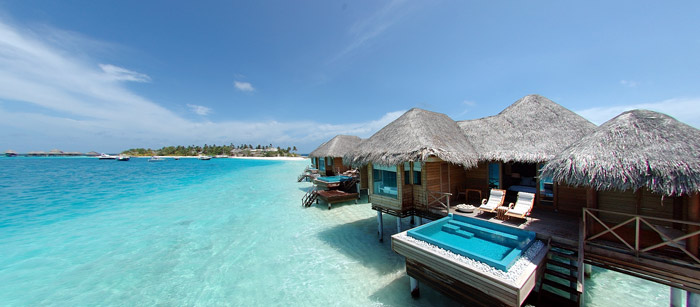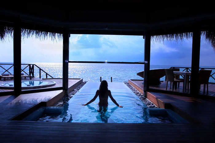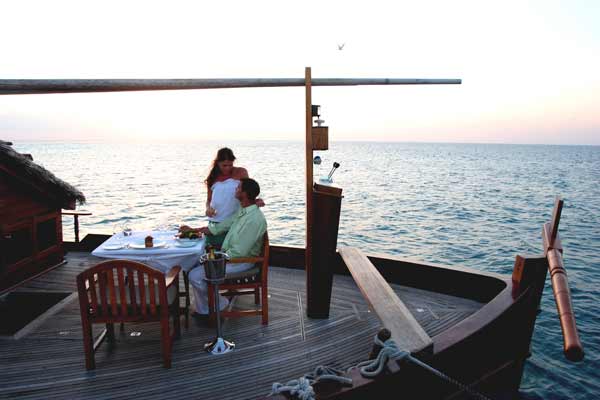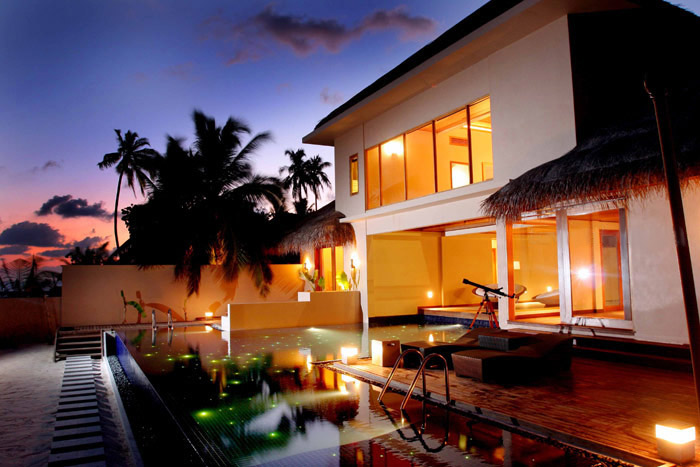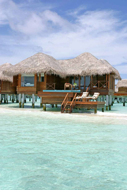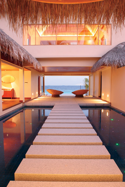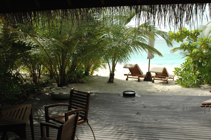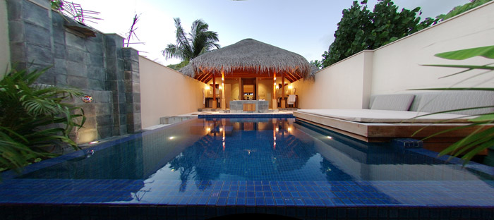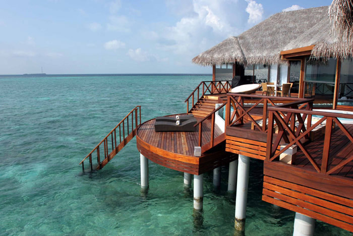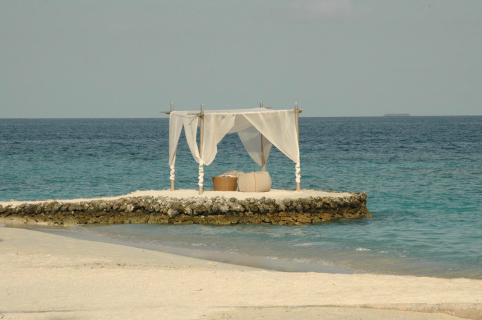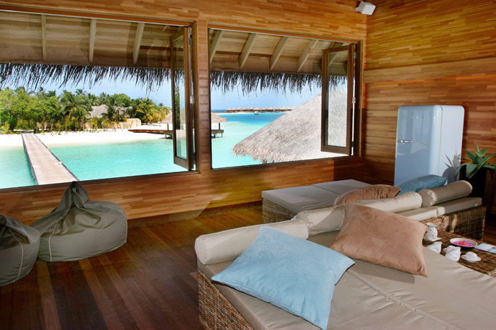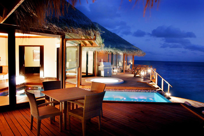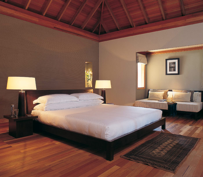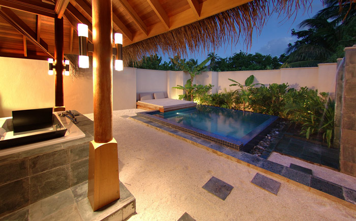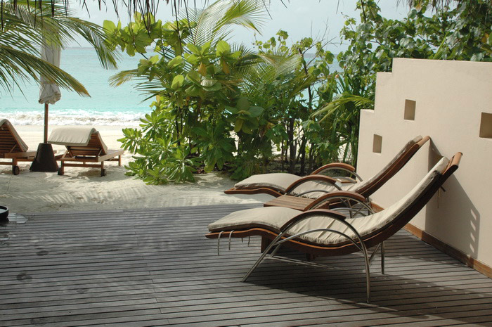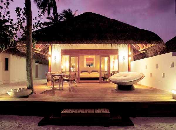 После 30-минутной поездки на быстроходном катере из международного аэропорта города Мейл гостей отеля встретит их личный дворецкий. Он проведет туристов к одному из 43 бунгало и павильонов, каждый из которых имеет собственный внутренний дворик, водопадный душ и палубы с обеденными столами, кушетками и стульями.