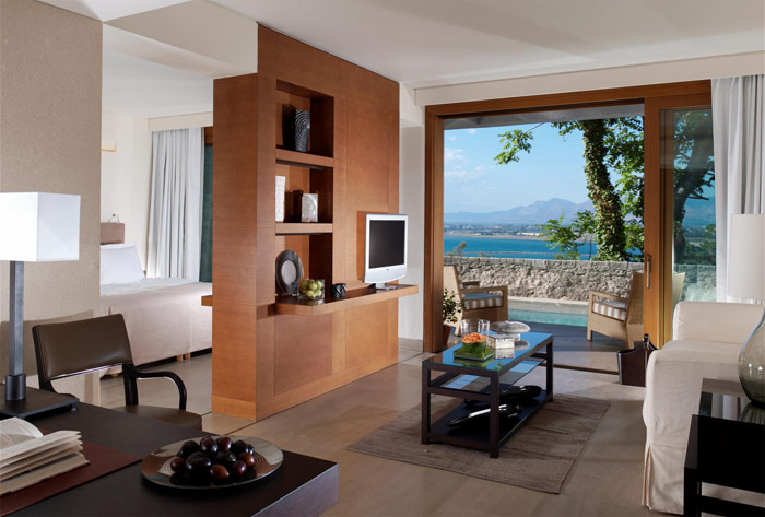 Deluxe Hotel Suites with Panoramic Sea View (75 кв. м) - состоит из спальни, отдельной гостиной, отделанной мрамором ванной комнаты с отдельной туалетной комнатой, двух балконов, откуда открывается великолепный вид на море и венецианскую крепость Bourtzi. Расположены в главном здании отеля. Макс. 4 человека.