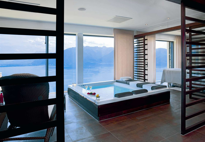 Deluxe Room (36 кв. м) - из окон великолепно обставленных номеров открывается прекрасный вид на Женевское озеро и горы. Номер состоит из спальни с двумя отдельными кроватями и небольшой гостиной зоной, облицованной мрамором ванной комнаты с ванной и душевой кабиной. Есть балкон.