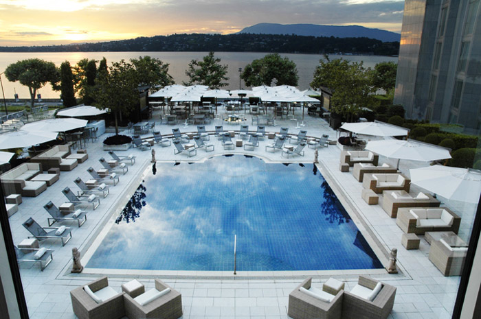 Полнопанорамный вид - 360° градусов - завораживающий. Будь то вид, открывающийся из гостиной, спальни или ванной комнаты - все виды озера восхищают. С одной стороны, Женевское озеро, с другой – его подернутая волнами гладь на фоне гор. Залитое утренним солнцем озеро возвещает о весенней поре. Ночью, лунный свет купается в озере, а городские огни сияют, отражаясь в нем. Эти виды вдохновляли знаменитых композиторов, проживающих в Royal Penthouse Suite, на создание их лучших творений. Балконы и террасы, возвышающиеся над бассейном гостиницы, устремлены на юг и приглашают к far niente, отведать вина и насладиться видами. Находясь в джакузи или в хаммам, гость может наслаждаться незабываемыми, таинственными пейзажами и видом величественного Мон Блана.