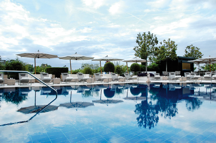 прекрасный вид на террасу, бассейн и на Женевское озеро