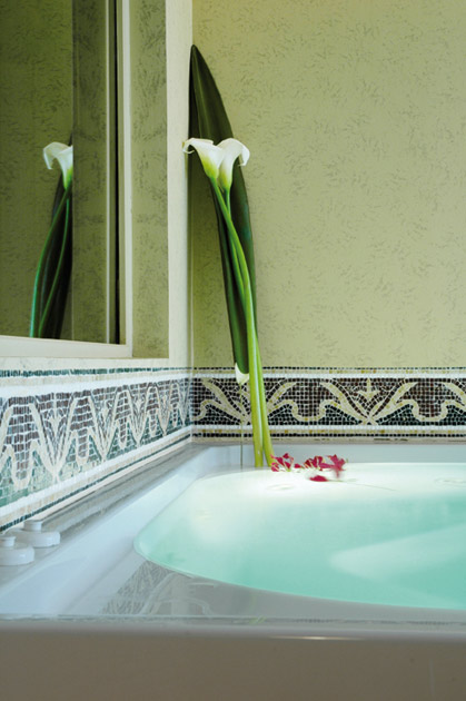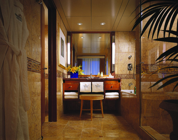 Номер располагает 6 ванными комнатами с мраморным полом, выложенным мозаикой, с джакузи и паровой ванной.